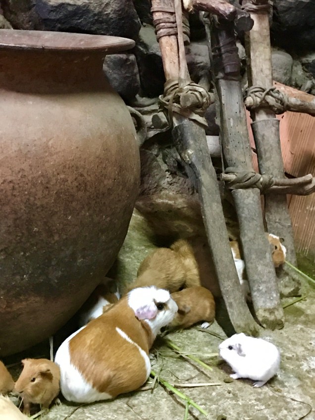 AND.. prepare to be most surprised by this next bit. In the home were little squealing guinea pigs scurrying all over the grey stone floors. Some babies, some bulging at the sides with new little guinea pigs waiting to be born. When inquiries were made we learned the cute little furry critters are for food. Yes. Mostly for very special occasions.