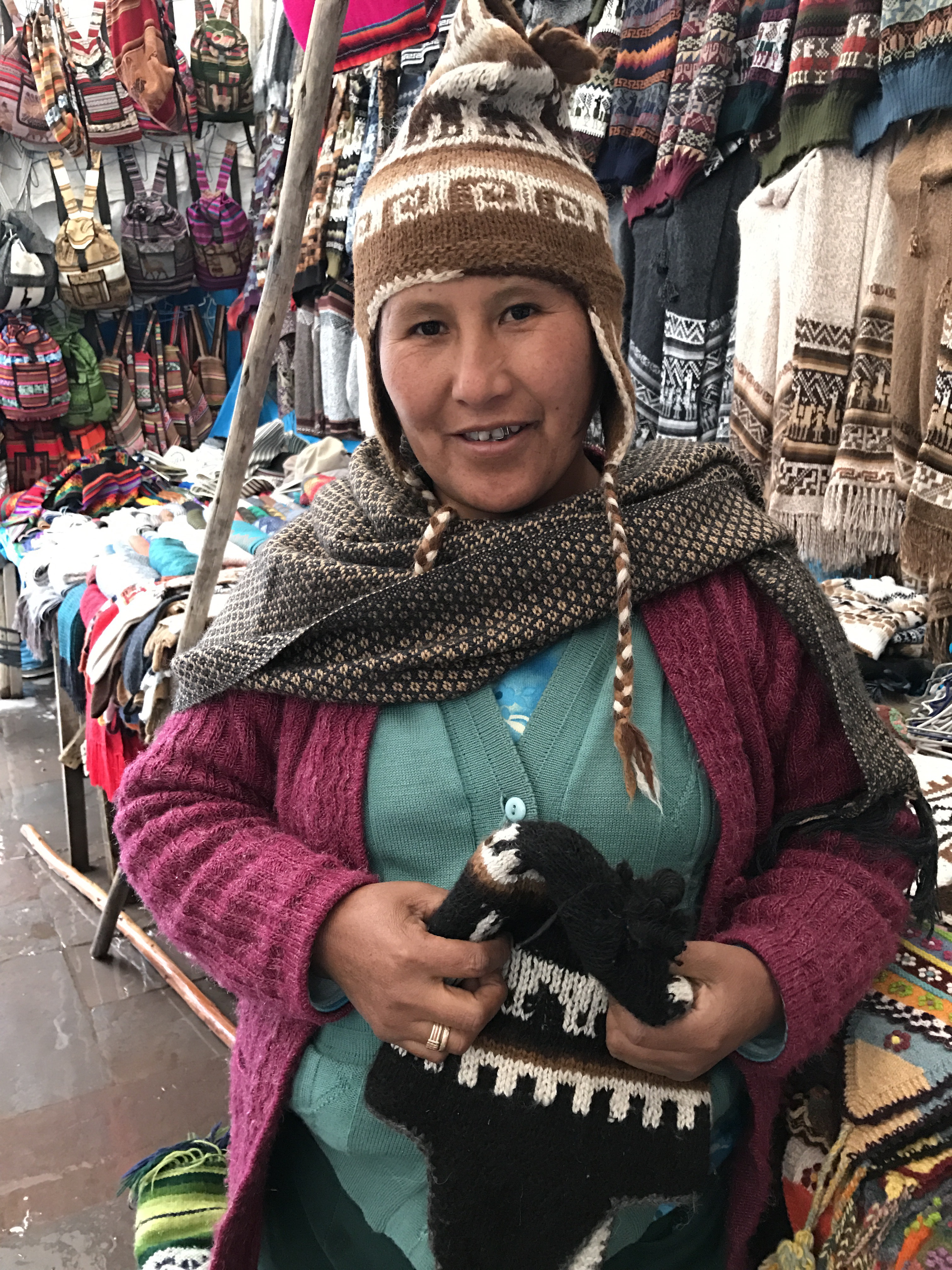 A little Quechua lady. How the ladies wear there very decorative hats is very important. If the hat is cocked to the side you are unmarried and straight on the head you are married. Each region of Peru has different style of hats. All her clothes were created or hand woven by her.